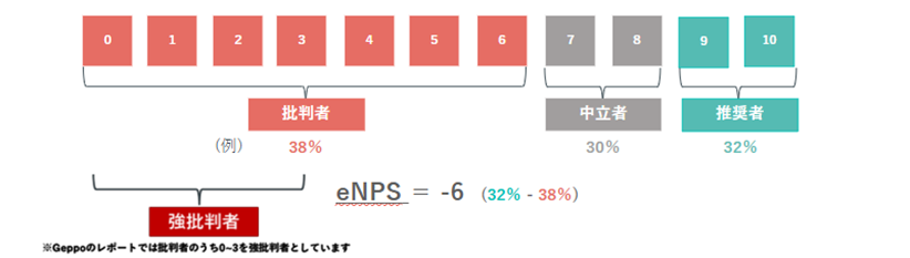 0~6点をつけた人を[批判者]、7・8点をつけた人を[中立者]、9・10点をつけた人を[推奨者]と分類し、[推奨者]の割合から[批判者]の割合を引いたものがeNPSです。